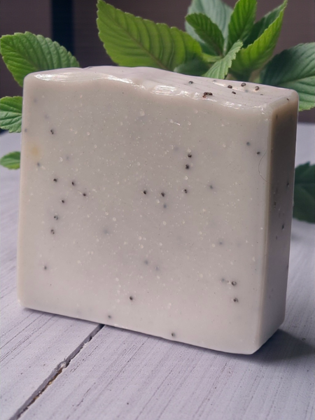 A deep-cleansing, handmade tallow-based soap with activated charcoal and exfoliating poppy seeds, scented with refreshing peppermint and purifying tea tree essential oils for a fresh, smooth, and revitalised feel.